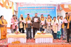 बहुउद्देशीय साधन सहकारी समिति लिमिटेड चन्द्रोटी के नव-निर्वाचित सभापति, उपसभापतियो के शपथ ग्रहण समारोह में प्रतिभाग करते कैबिनेट मंत्री गणेश जोशी।